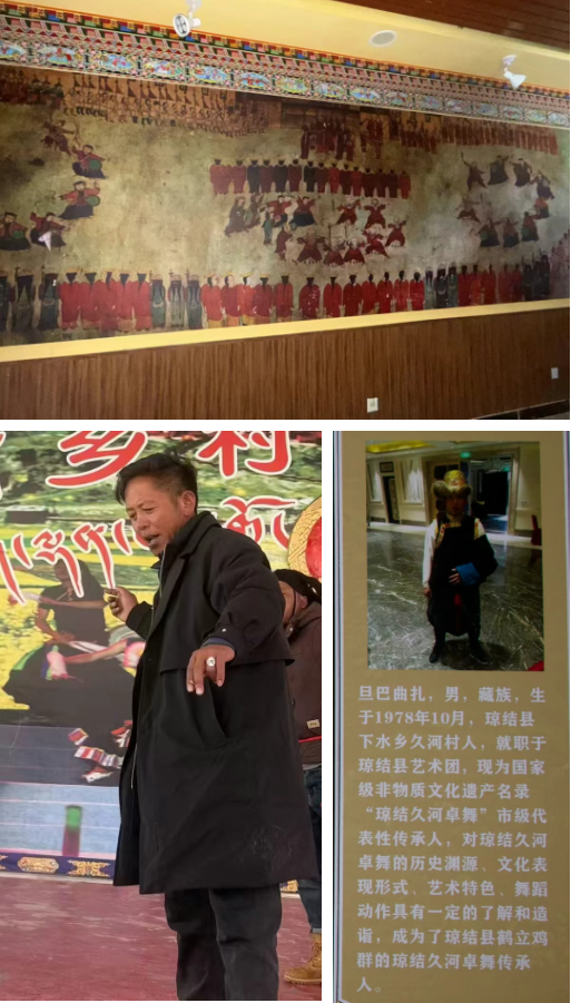 “甩发、击鼓、踏步”三位一体技法体系的久河卓舞,是具有1200年历史的国家级非物质文化遗产。受访的传承人旦巴曲扎告诉上戏学子:“久河卓舞被誉为桑耶寺古壁画的‘活态文物’,每一个动作都与千年前的壁画记载高度吻合。”作为琼结县艺术团的编导,旦巴曲扎师从国家级传承人尼玛旺久学习卓舞30余年,他参与的久河卓舞曾获得中国民间文艺最高奖项“山花奖”,并参加2025年央视春晚拉萨分会场演出。他每年冬季都会在村里开办免费培训班。在西藏自治区成立60周年之际,他作为领队带领70多位村民去布达拉宫广场演出,受到各界的高度肯定。
