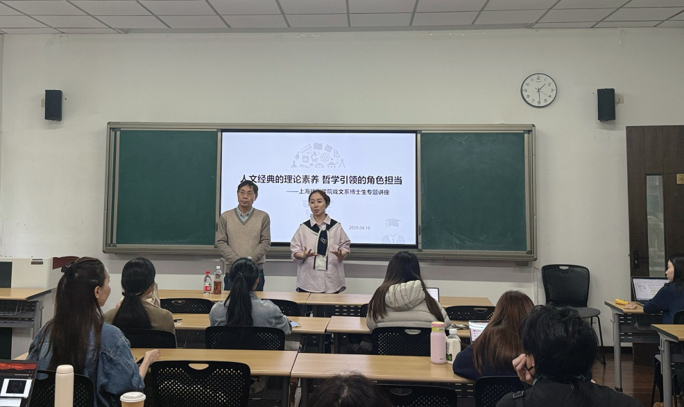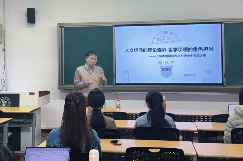 2026年4月16日,上海戏剧学院戏文系特邀张生泉教授,带来一场题为“人文经典的理论素养与哲学引领的角色担当”的专题讲座,这也是博士生课程《戏剧学及人文经典前沿理论研究》第三讲。原定三小时的讲座竟在张老师声情并茂的讲课与同学们热情投入的听课中延伸至四小时。以深厚的学养、鲜活的案例、真挚的情怀,将哲学思辨、戏剧教育、人生阅历与时代使命熔于一炉,是这次讲座的主线。它既有高屋建瓴的理论高度,又有直抵人心的实践温度,为在场学子献上一堂兼具思想力、感染力与启发性的学术盛宴。
